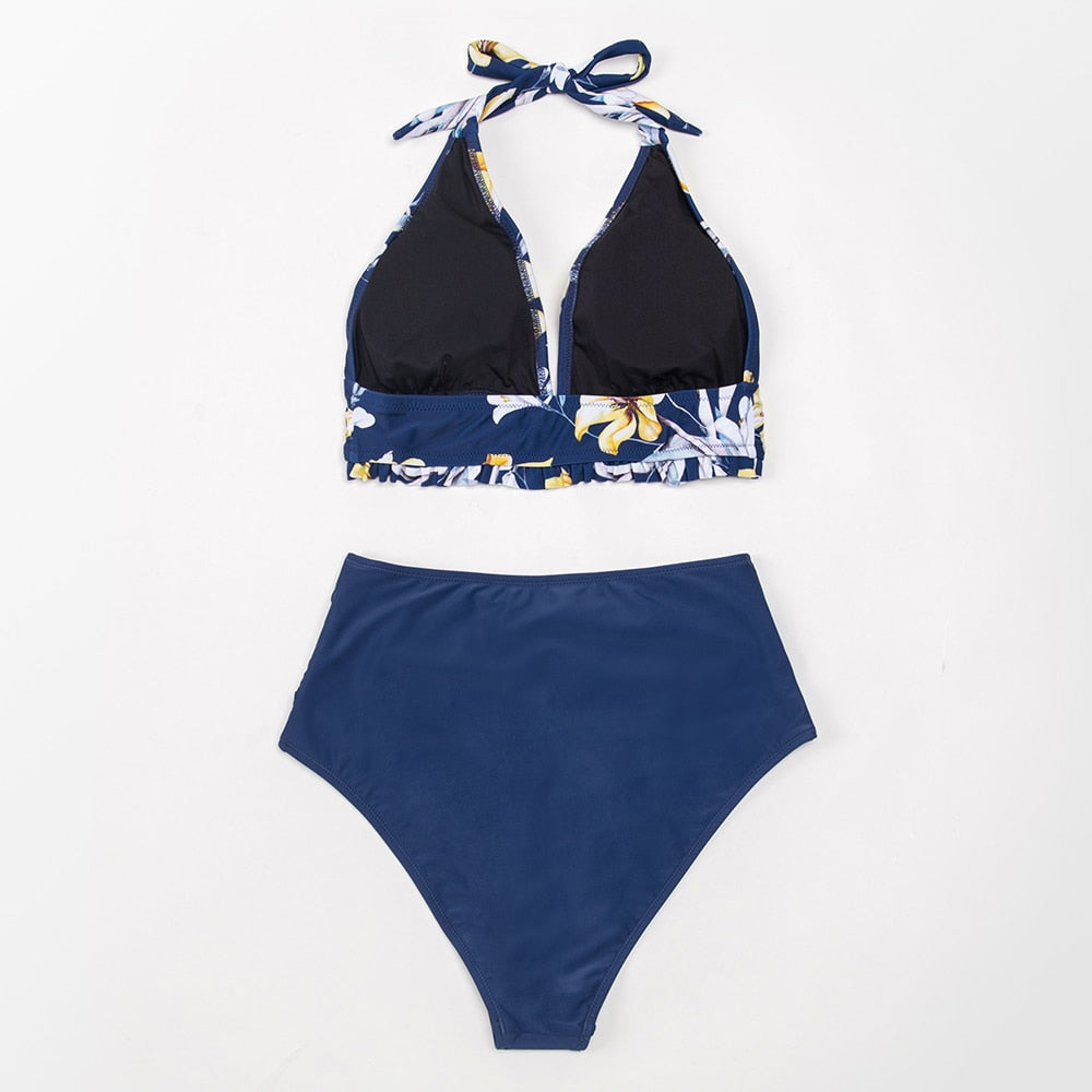 Bikini Anudado con Estampado Floral en Fondo Azul - Cintura Alta
