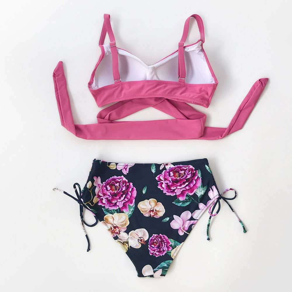 Bikini Rosado Floral Anudado con Cordones Ajustable - Cintura Alta
