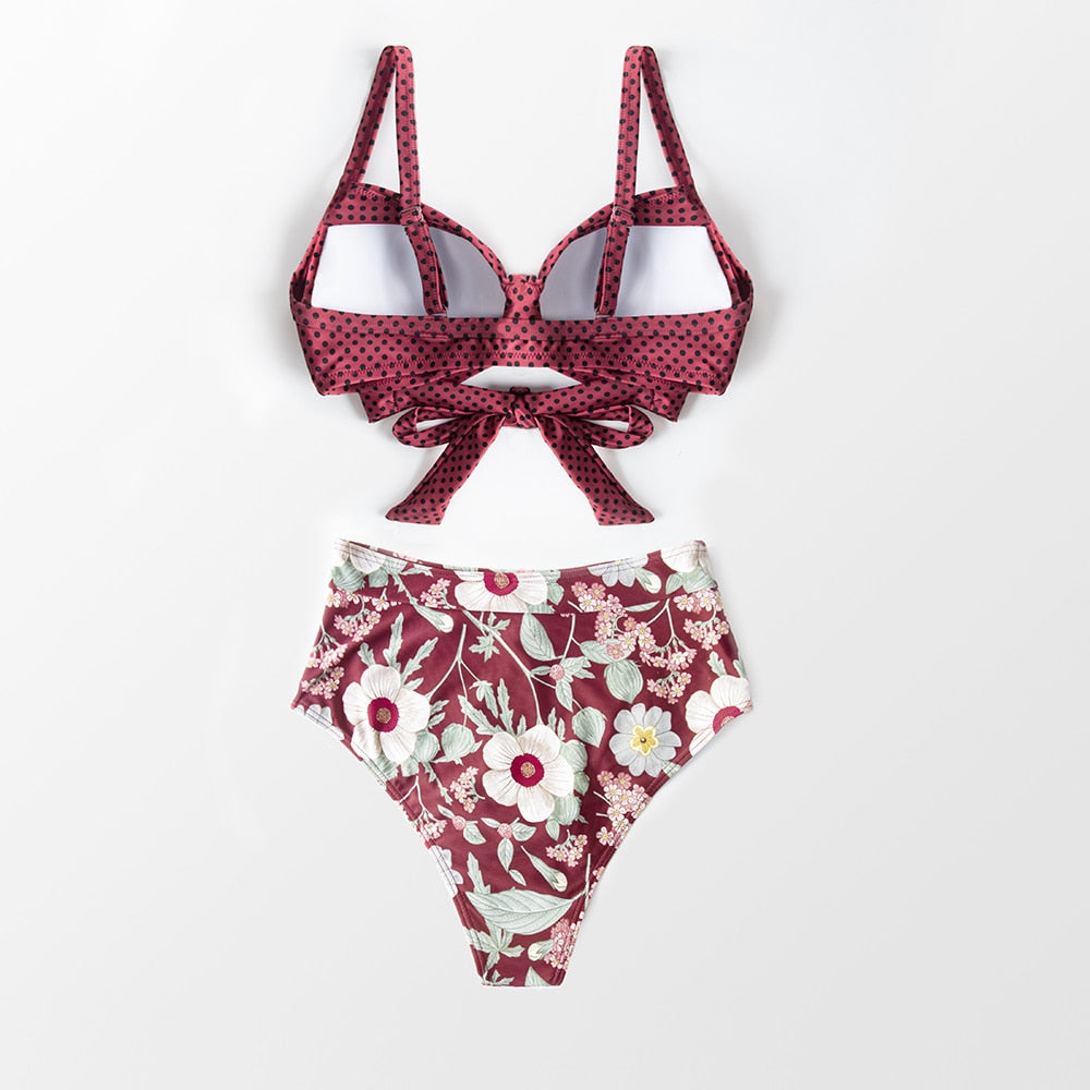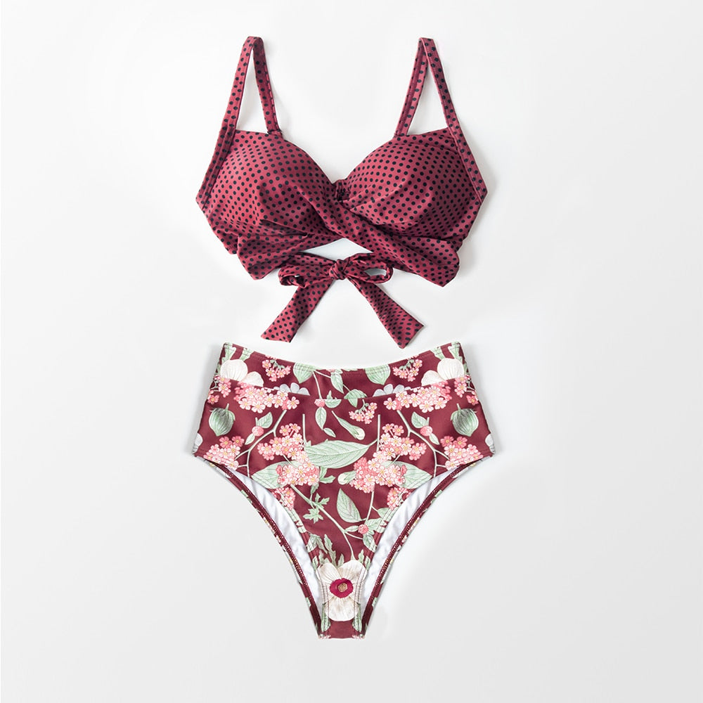 Bikini con Copas de Estampado Floral y Lunares - Cintura Alta