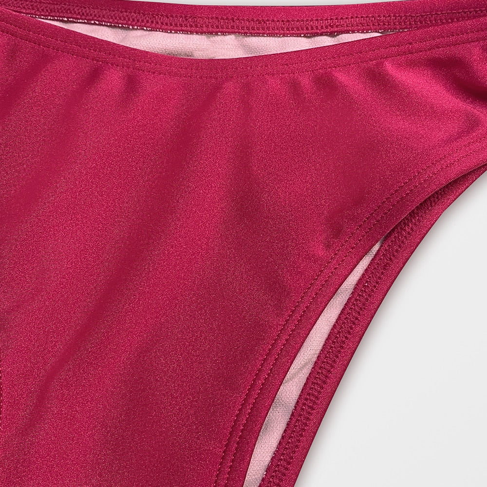 Abraza tu lado salvaje con este conjunto de bikini que presenta un bralette con escote en V, corte frontal y tirantes ajustables, así como un par de braguitas hipster de colores enteros, cintura de talle alto y costados fruncidos.