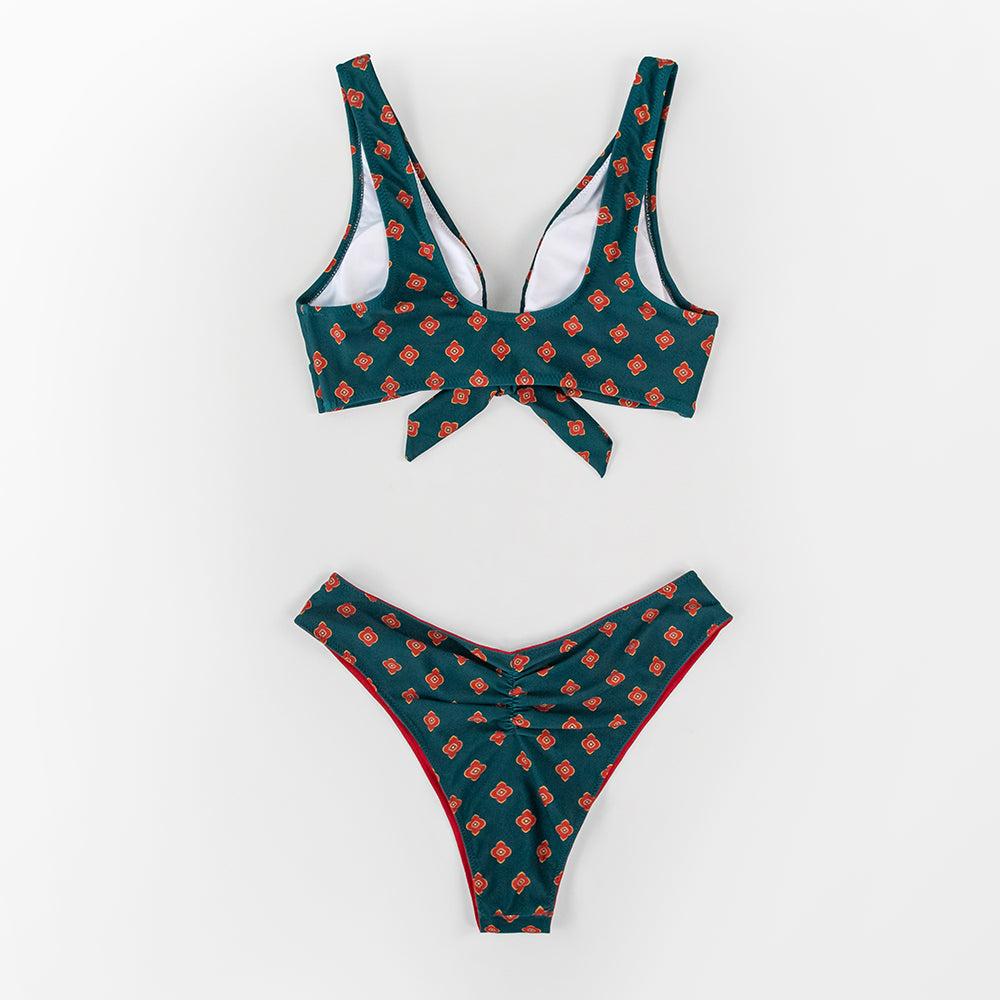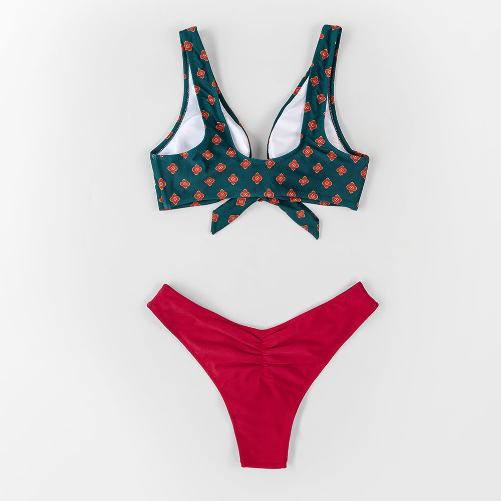 ¡Llamativo, lindo y perfecto para la playa o junto a la piscina! Nuestro conjunto de bikini retro mini floral con cuello en V presenta un mini bikini con estampado floral con detalle de nudo en la parte delantera. La braguita del bikini a juego es reversible. Un lado es un mini estampado floral y el otro es rojo sólido.