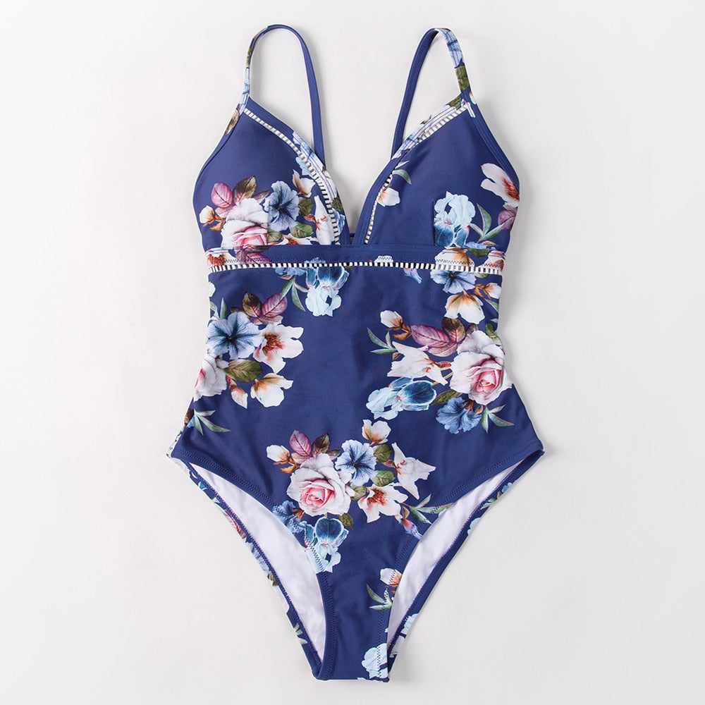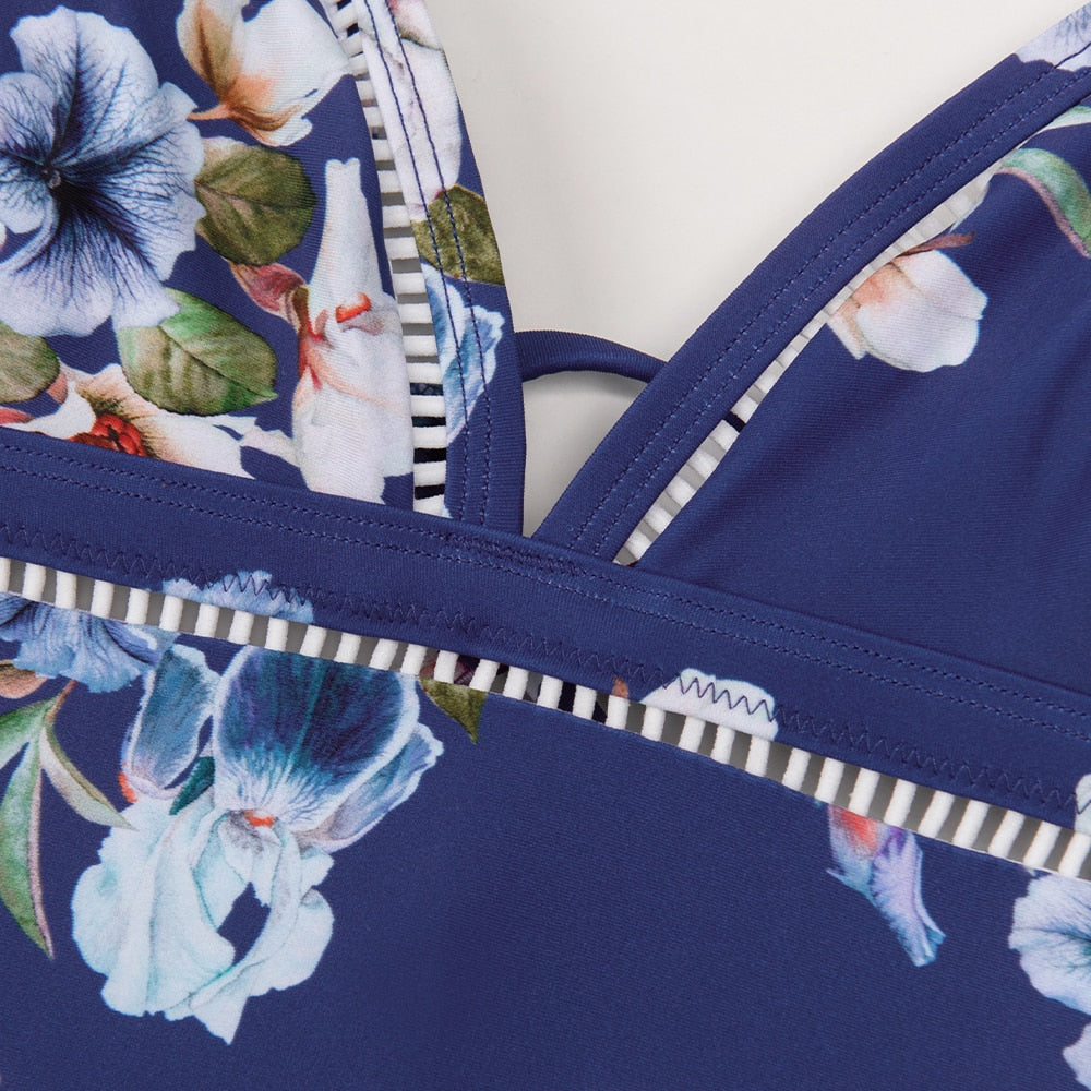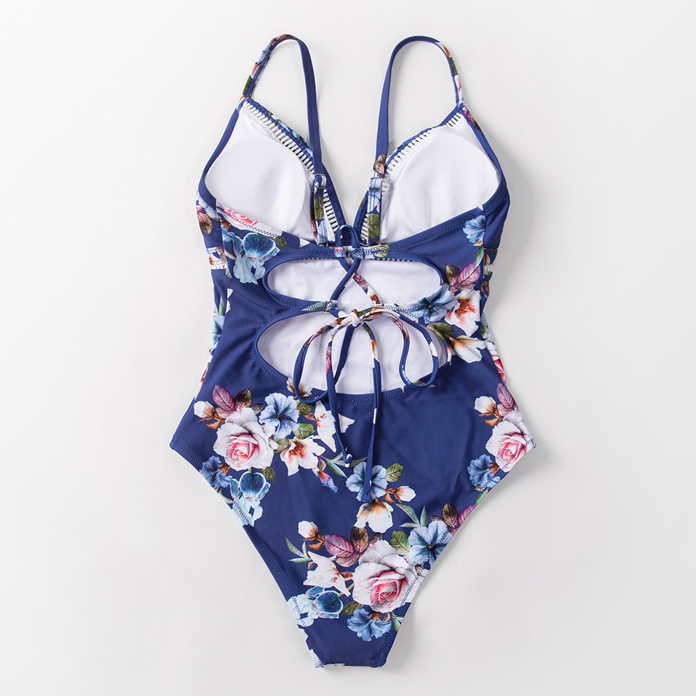 Traje de Baño Azul Floral con Cordones Ajustables - Una Pieza