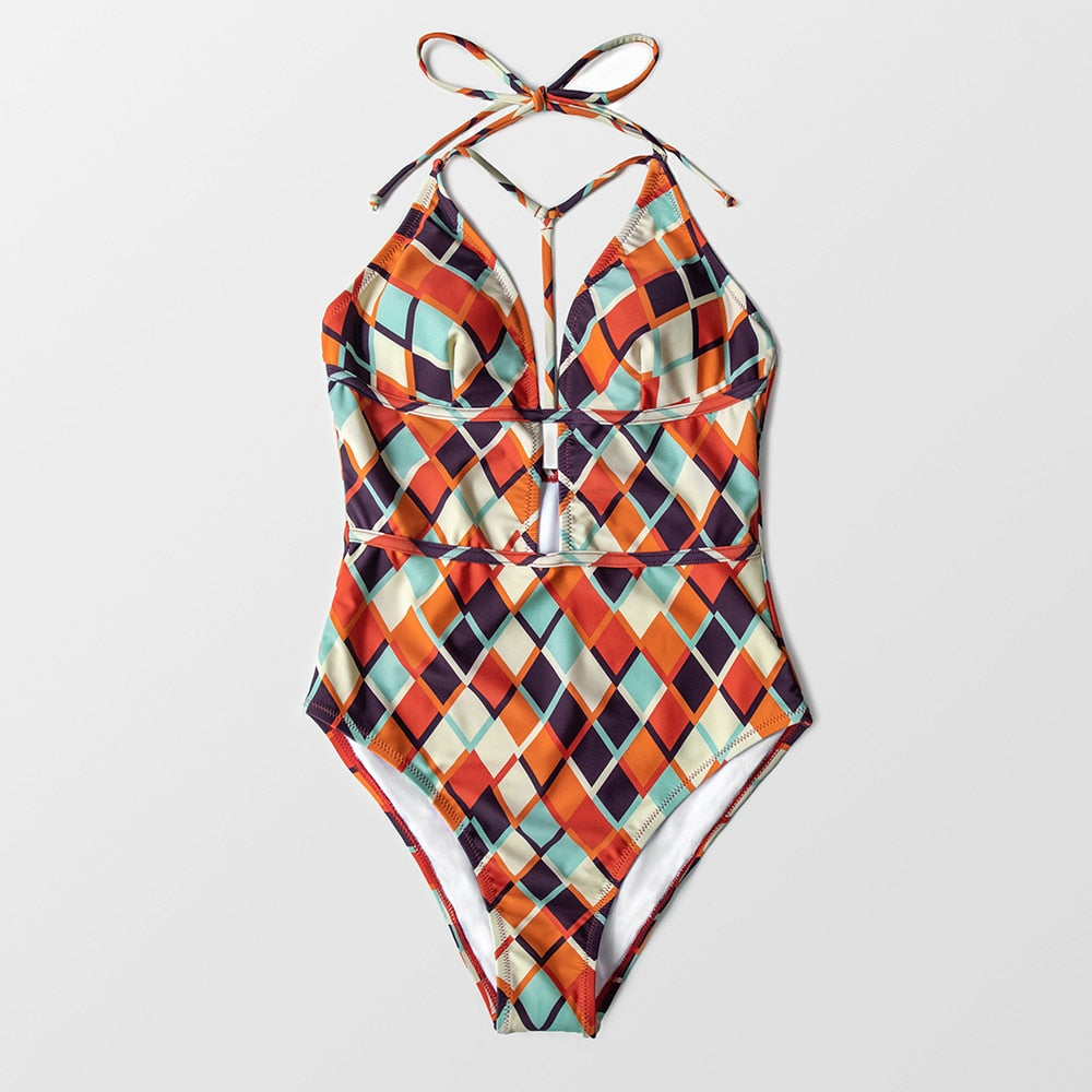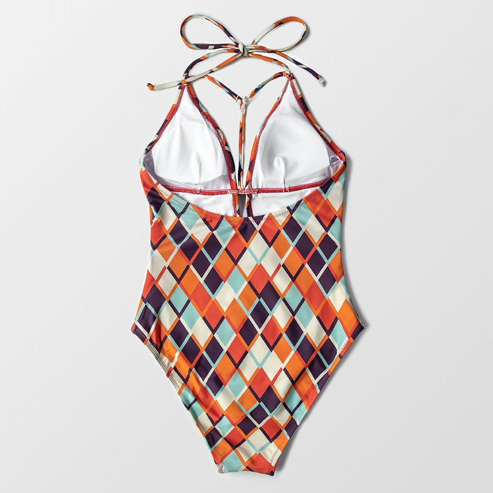 Traje de Baño con Escote Pronunciado y Estampado Geométrico - Una Pieza