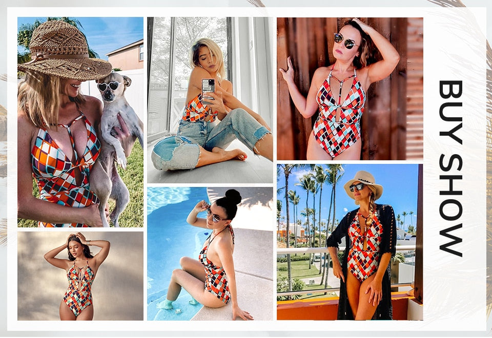 Nos encantan las vibraciones vintage de los 70 en este bañador de una pieza con escote pronunciado y estampado geométrico. Los detalles de tiras en el pecho hacen que este colorido traje de baño se destaque del resto.