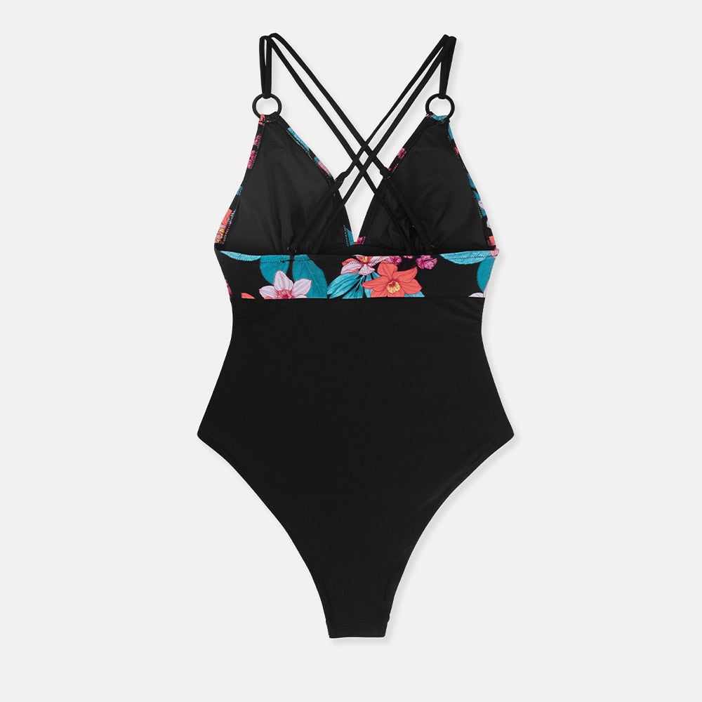 Traje de Baño Negro Romántico con Junta Tórica Floral - Una Pieza
