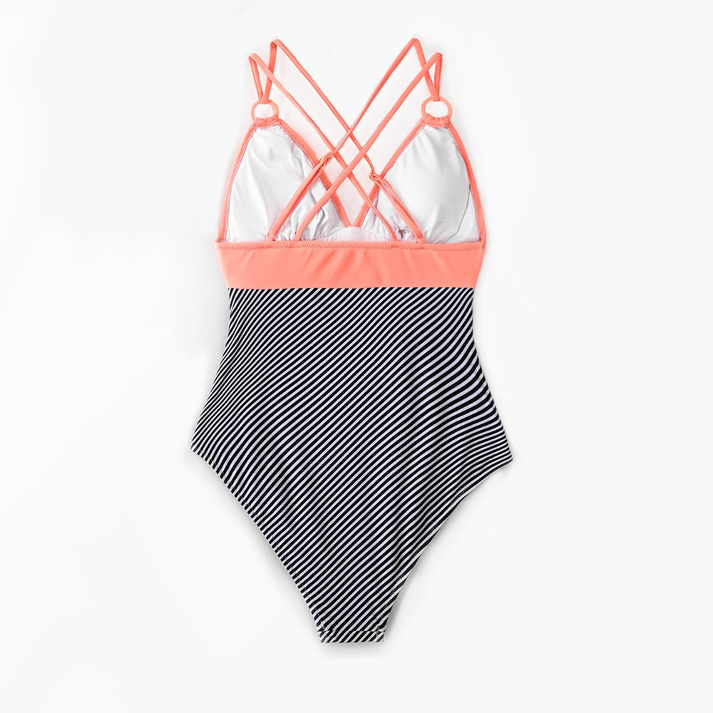 Traje de Baño Rosa Romántico con Junta Tórica a Rayas - Una Pieza