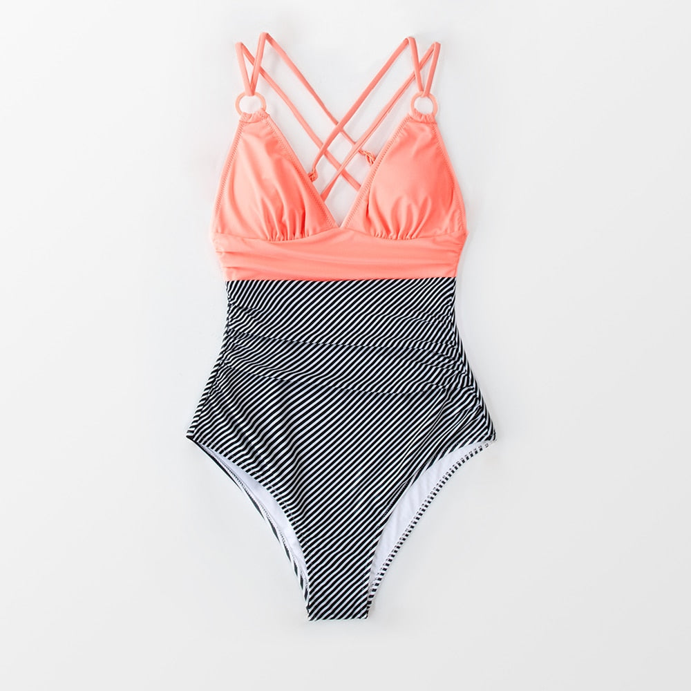 Luce genial y siéntete cómodo con el traje de baño de una pieza con juntas tóricas Rosa a rayas. Este aturdidor de verano presenta tirantes dobles, diseño de juntas tóricas y un hermoso estampado rayado.. ¡El traje perfecto para el verano!