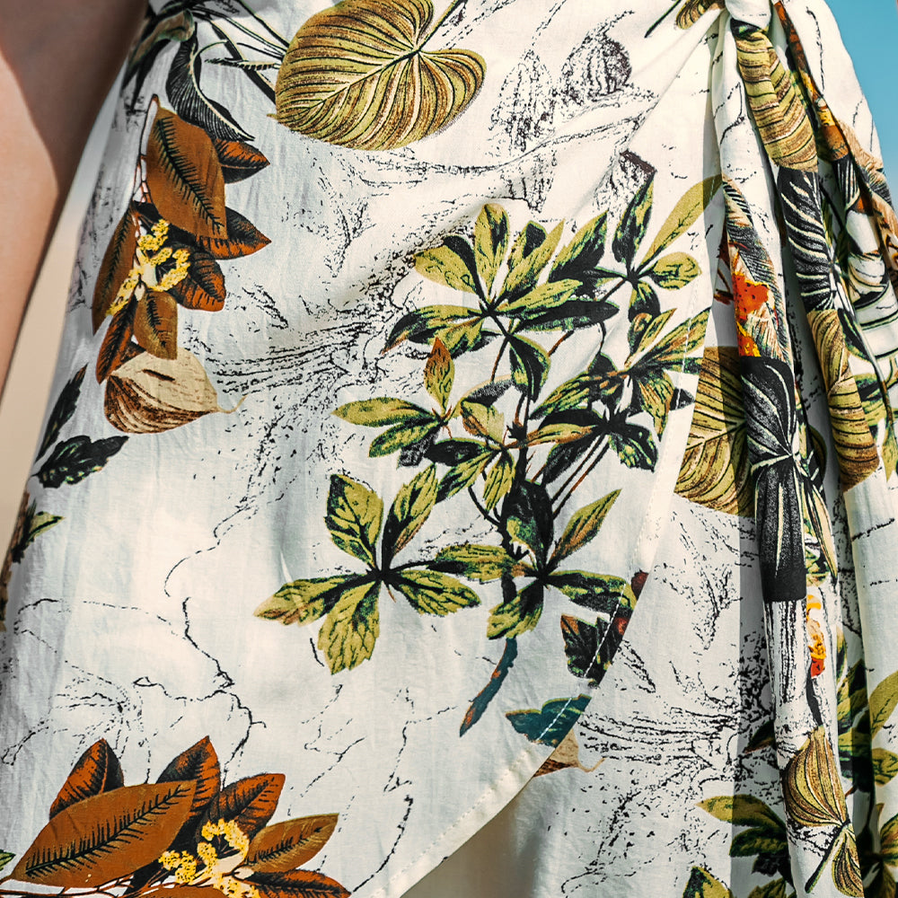 Vestido Corto con Cinturón y Estampado de Hojas Tropicales de Cuello en V