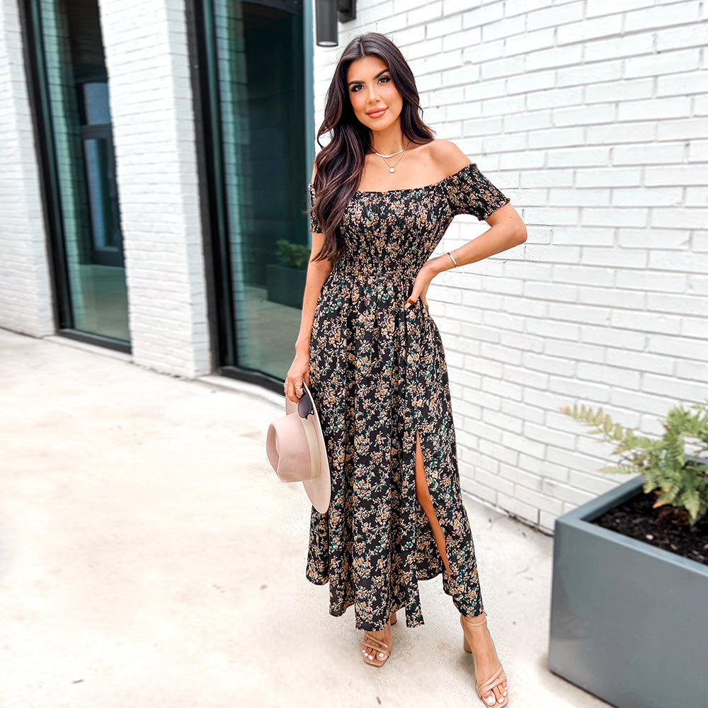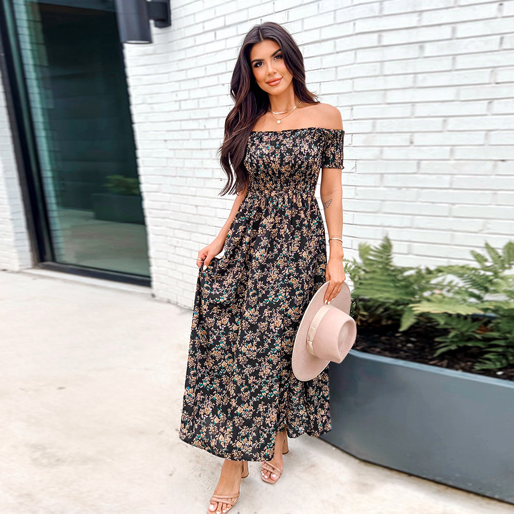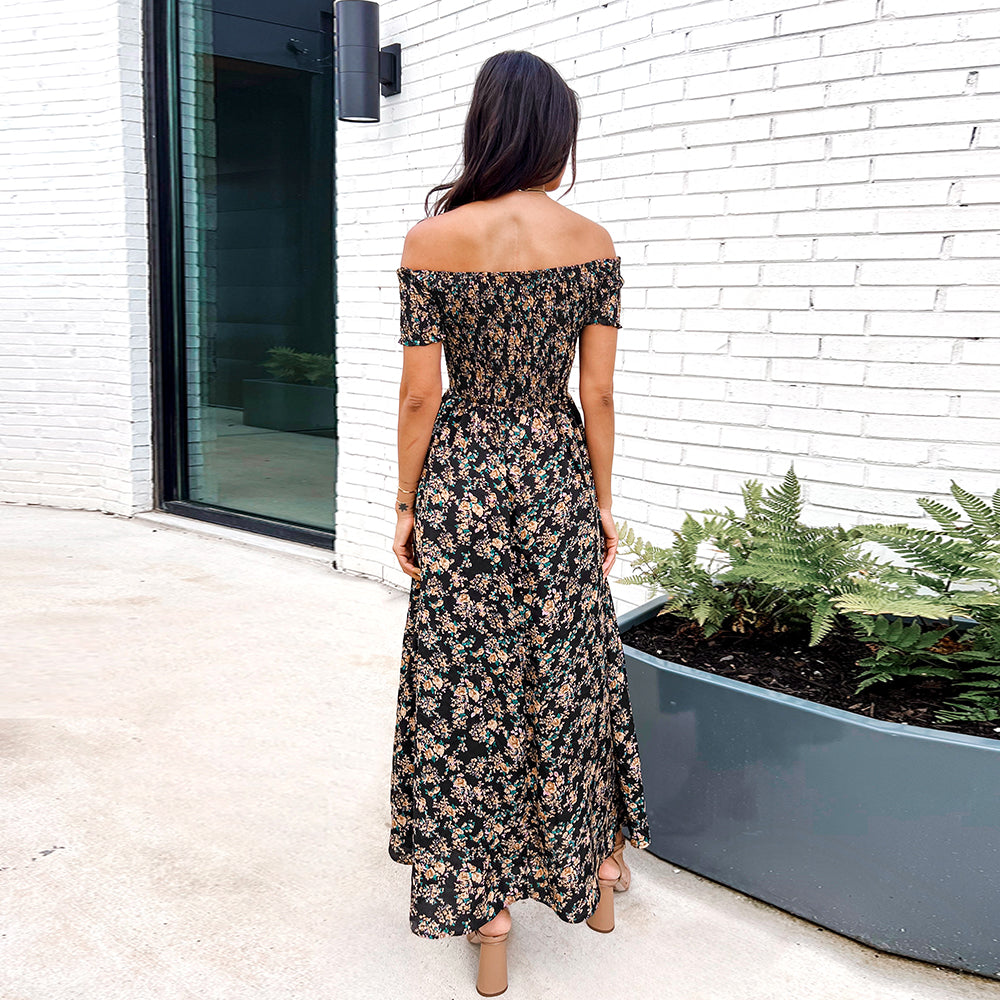 Este vestido largo con hombros descubiertos y estampado floral de corte en A te brinda un toque moderno y lujoso. Hecho con material suave al tacto, ofrece una ajuste cómodo sin perder el estilo. El estampado floral lo hace ideal para cualquier ocasión. ¡El look perfecto para lucir esplendorosa!