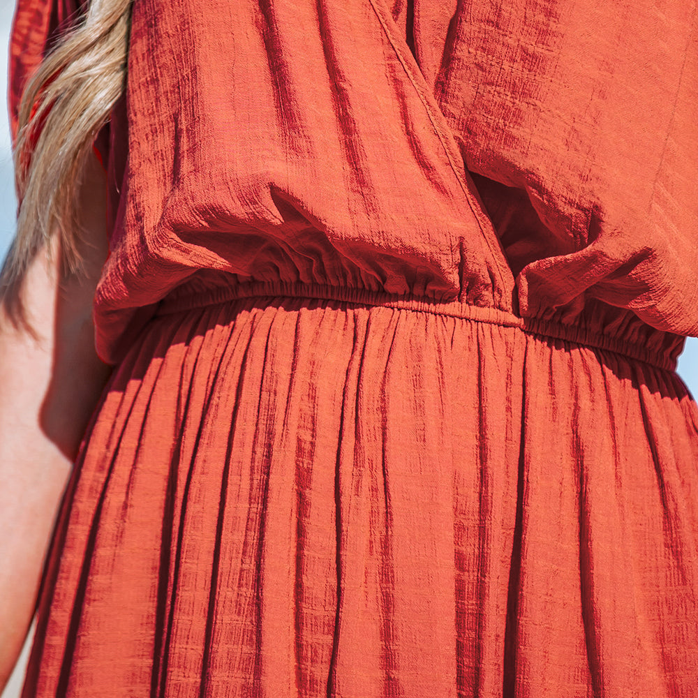 Vestido Largo Fruncido de Manga Corta con Cintura Elástica