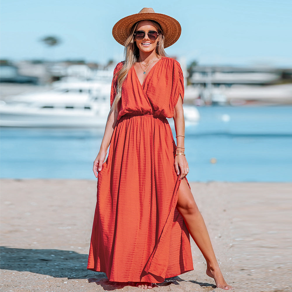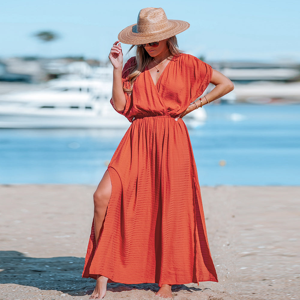 ¡Este vestido largo de mangas cortas es ideal para los calurosos días de verano! Está fabricado con tejidos transpirables y elásticos, para que siempre se sienta cómoda. La elegante cintura elástica añade un toque de glamour al vestido. Te mantendrás fresca y al mismo tiempo hermosa.