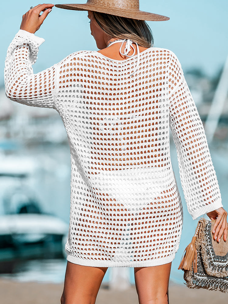 Vestido Playero Blanco de Punto de Ganchillo para mujer y Cuello Redondo