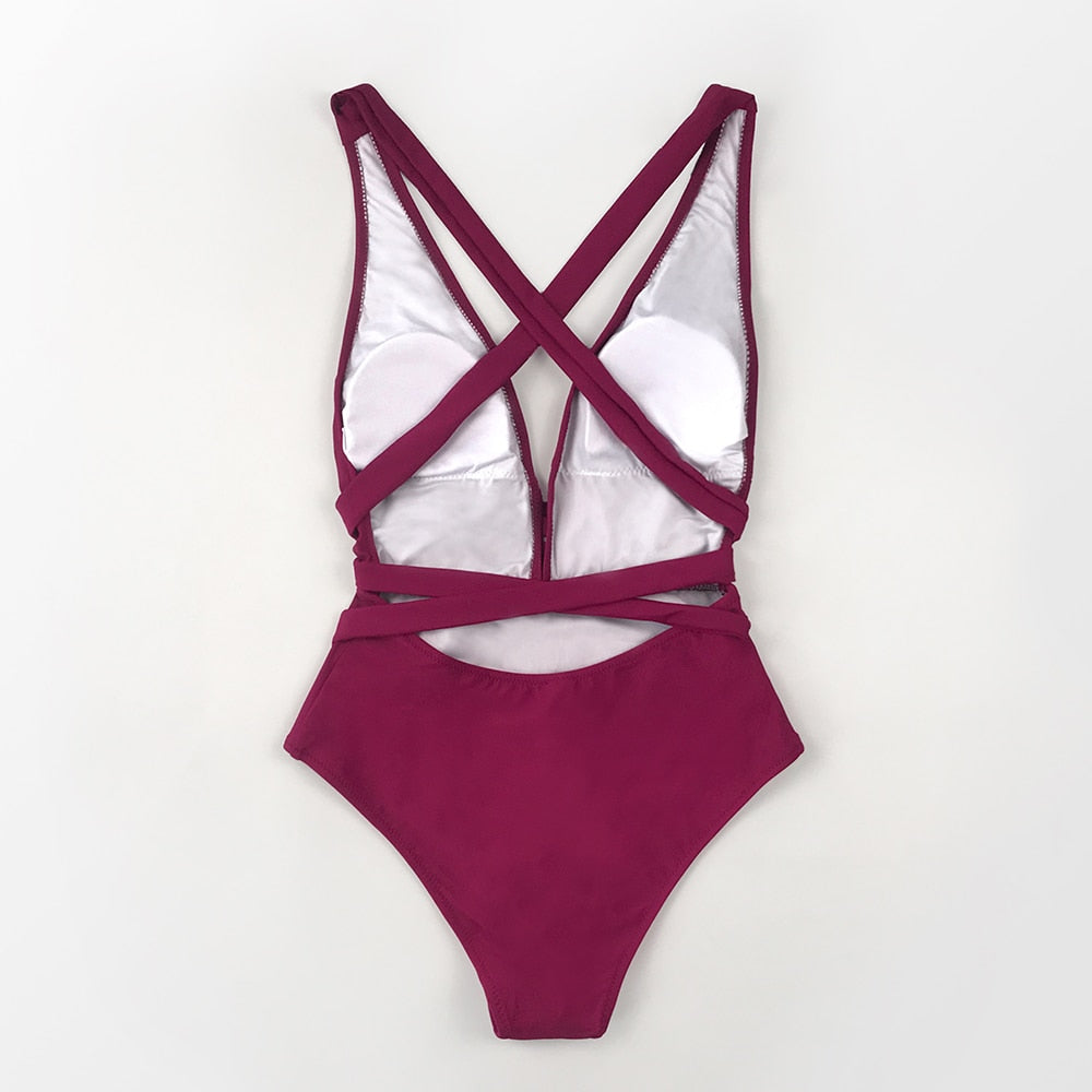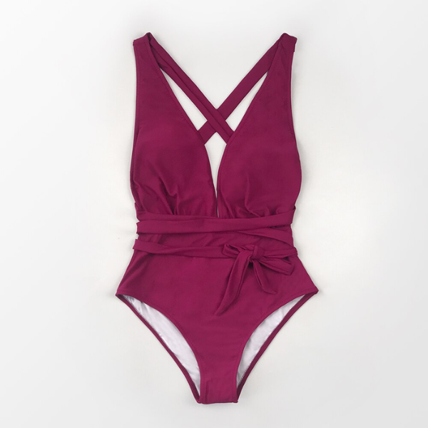 Tan elegante y sexy, este traje de baño de una pieza rojo profundo con cuello en V es el traje de baño femenino que has estado buscando. Un detalle de lazo en la parte delantera actúa como un cinturón, para un efecto favorecedor de la figura. Combínalo con tu sombrero de paja favorito y disfruta del sol con estilo.