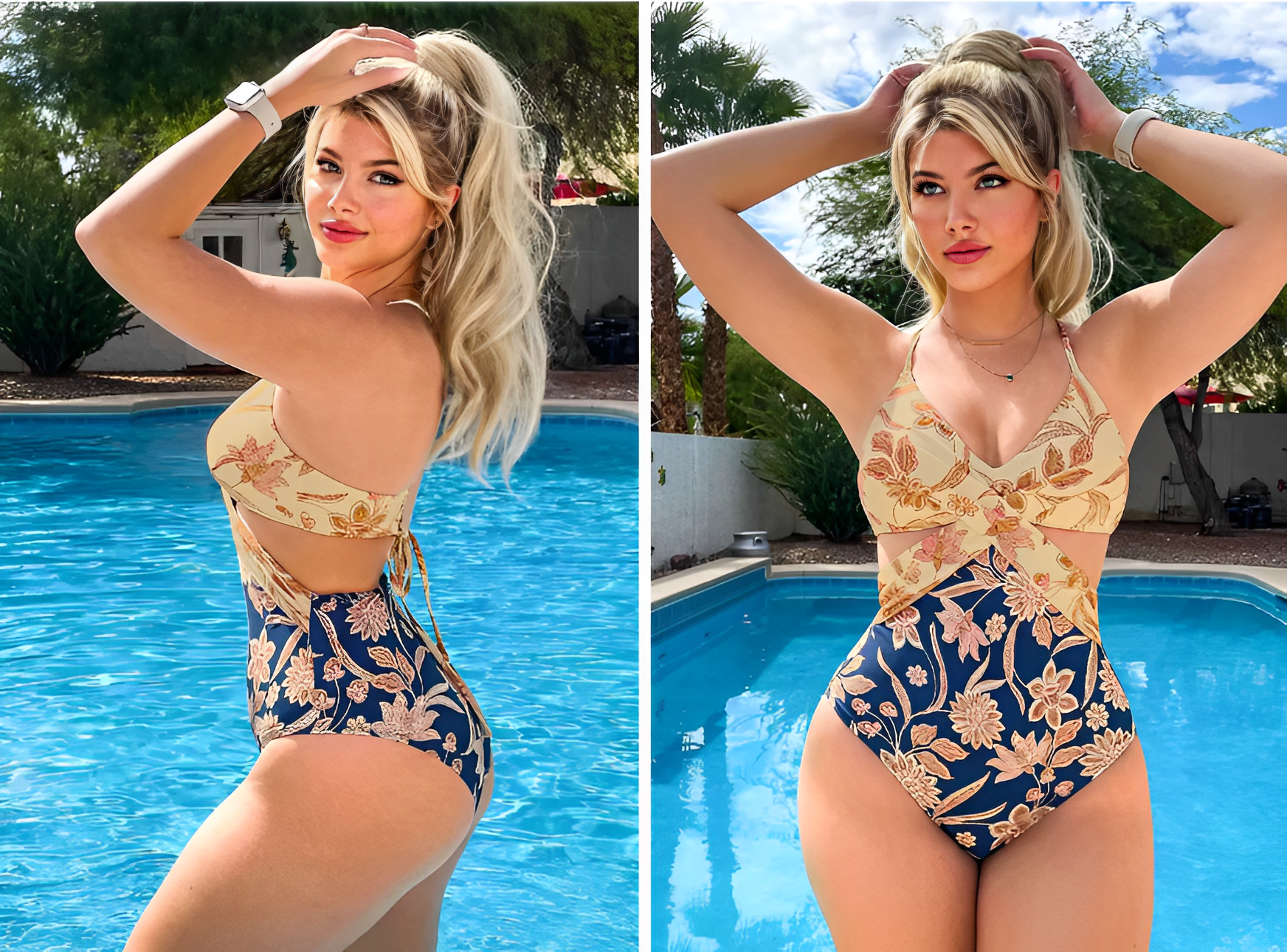 ¡Conviértete en una diosa de la playa con este traje de baño monokini! Con un estampado floral integral, un diseño de bloques de colores, un frente recortado con tiras cruzadas y tirantes ajustables.